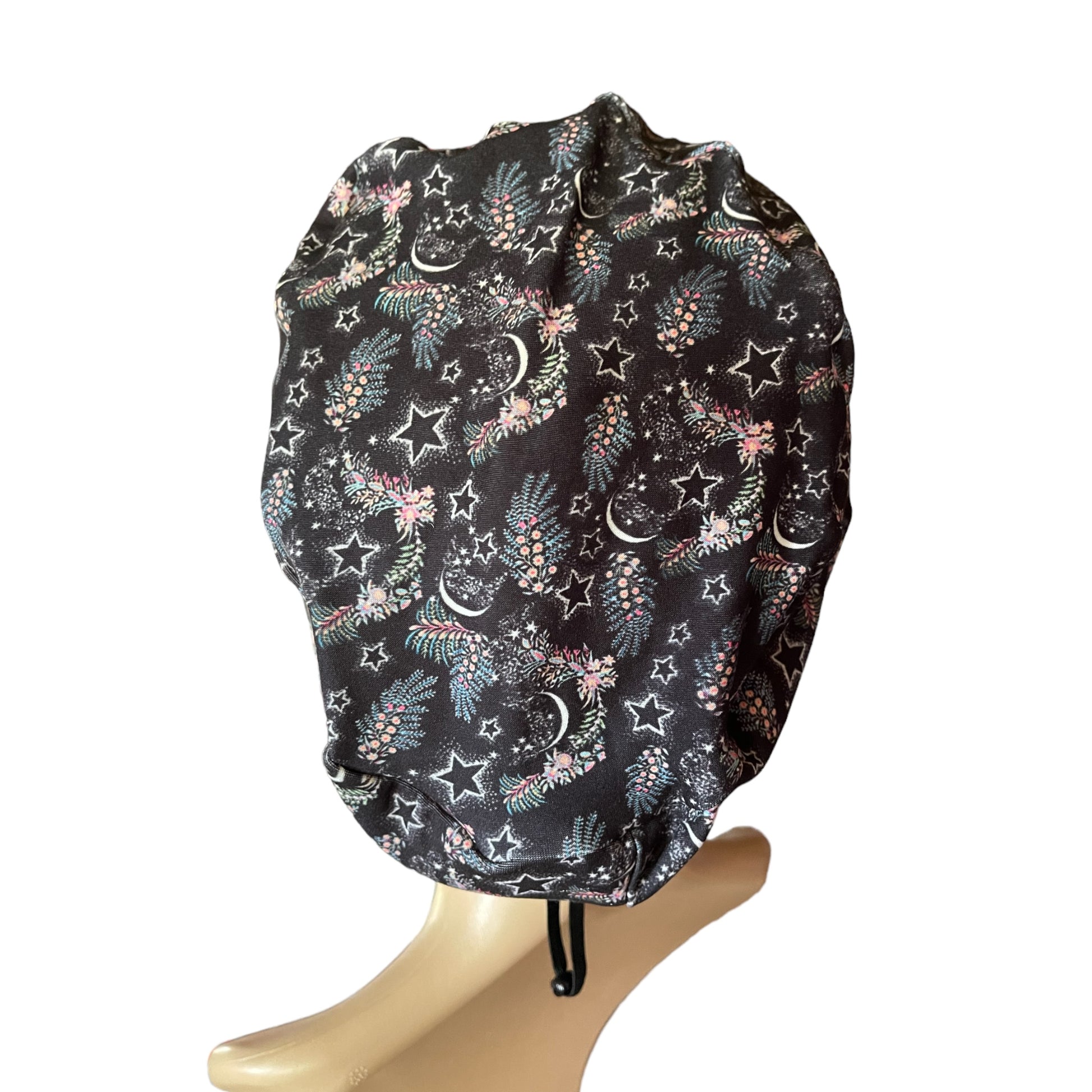Moon, Stars, Floral Black Design Pattern ∙ Scrub Cap Soft & Stretchy ∙ Euro or Unisex style hat ∙ Satin lined option ∙ Adjustable Nurse Cap (Copy) (Copy)